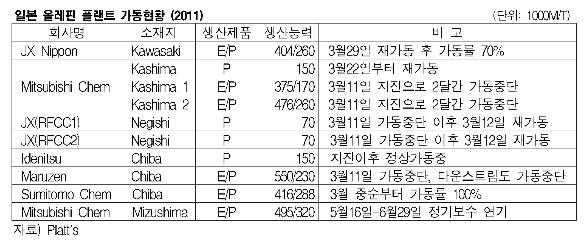 그러나 Mitsubishi Chemical은 Kashima 소재 No.1 에틸렌 37만5000톤 및 프로필렌 17만톤 크래커와 No.2 에틸렌 47만6000톤 및 프로필렌 26만톤 크래커를 지진피해로 2달간 가동중단에 들어갔다. 표, 그래프: < 일본 올레핀 플랜트 가동현황 (2011) > <화학저널 2011/04/08> |