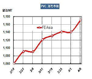 PVC 가격은 4월6일 CFR FE Asia 톤당 1171달러로 30달러 상승했다.