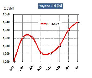 에틸렌 가격은 4월8일 FOB Korea 톤당 1341달러로 10달러 상승했다.