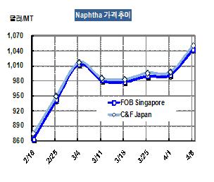 나프타 가격은 4월8일 C&F Japan 톤당 1050달러로 52달러 급등했다.