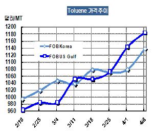 톨루엔 가격은 4월8일 FOB Korea 톤당 1138달러로 60달러 급등했다.