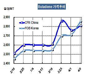 부타디엔 가격은 4월8일 FOB Korea 톤당 2860달러로 150달러 폭등했다.