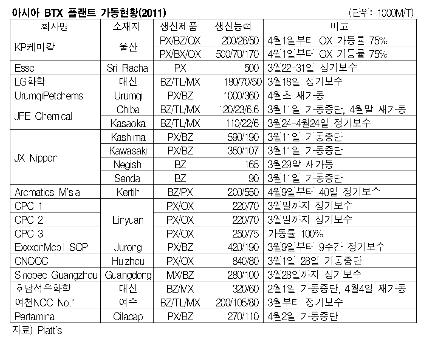 표, 그래프: < 아시아 BTX 플랜트 가동현황(2011) > <화학저널 2011/04/18> |