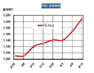 PVC 가격은 4월13일 CFR FE Asia 톤당 1211달러로 40달러 상승했다.