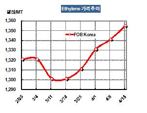 에틸렌 가격은 4월15일 FOB Korea 톤당 1355달러로 14달러 상승했다.