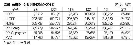 표, 그래프: < 중국 폴리머 수입현황(2010-2011) > <화학저널 2011/04/18> |