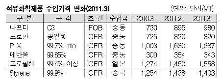 표, 그래프: < 석유화학제품 수입가격 변화(2011.3) > <화학저널 2011/04/19> |