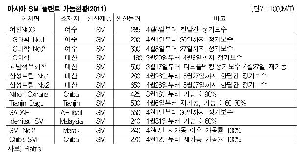SM 시장 관계자는 “2011년 정기보수는 2010년에 잡힌 스케줄대로 진행되고 있으며 건축경기호조로 SM 수요가 확대돼 가격이 높아질 것으로 예상된다”며 “일본의 대지진 여파로 중단됐던 플랜트들도 풀가동으로 물량을 확보하고 있다”고 설명했다.