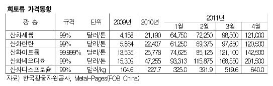 희토류(Rare Earth) 가격이 2011년 들어 하늘 높은 줄 모르고 치솟고 있다.