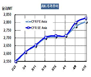 아시아 AN 시세는 4월12일 CFR FE Asia 톤당 2805달러로 30달러 상승했다.