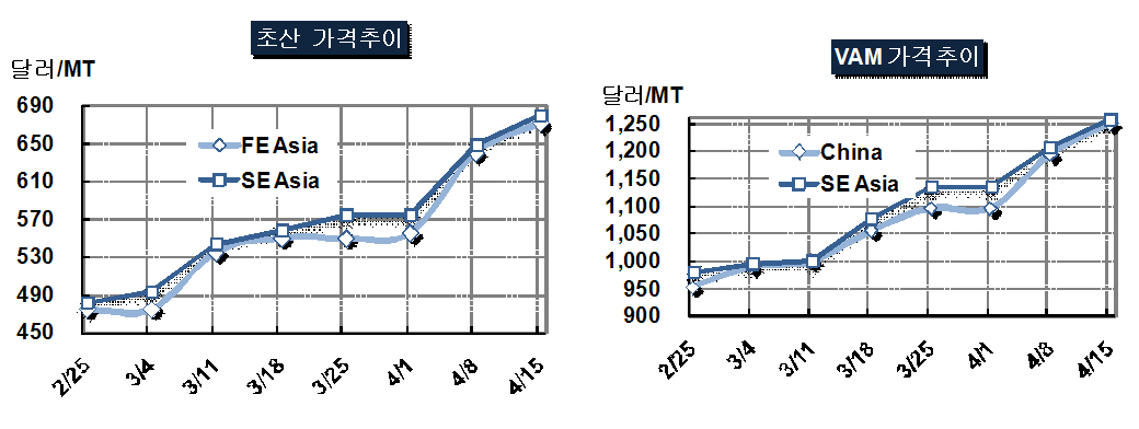 Celanese가 초산 가동을 중단하면서 다운스트림 VAM(Vinyl Acetate Monomer) 30만톤 플랜트도 멈춰 중국 내수가격이 톤당 350위안 오른 8850위안을 형성했으며, 4월14일 CFR China도 전월대비 200달러 가까이 오른 1247.5달러를 나타냈다.
