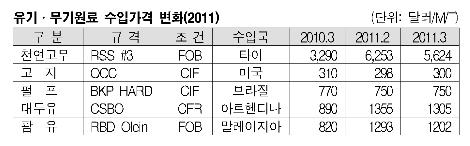 표, 그래프: < 유기ㆍ무기원료 수입가격 변화(2011) > <화학저널 2011/04/22> |