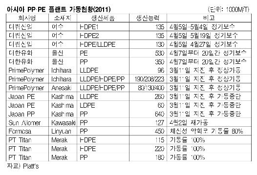 표, 그래프: < 아시아 PP·PE 플랜트 가동현황(2011) > <화학저널 2011/04/22> |