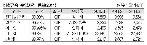 표, 그래프: < 비철금속 수입가격 변화(2011) > <화학저널 2011/04/25> |