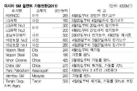표, 그래프: < 아시아 SM 플랜트 가동현황(2011) > <화학저널 2011/04/25> |