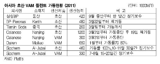 표, 그래프: < 아시아 초산·VAM 플랜트 가동현황 (2011) > <화학저널 2011/04/26> |