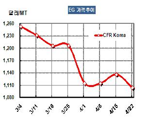 MEG 가격은 4월22일 CFR China 톤당 1104달러로 32달러 하락했다.
