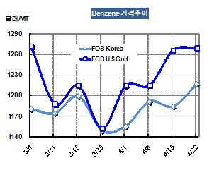벤젠 가격은 4월22일 FOB Korea 톤당 1217달러로 33달러 상승했다.