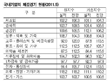 표, 그래프: < 국내기업의 체감경기 현황(2011.5) > <화학저널 2011/04/27> |