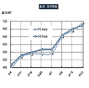 초산 가격은 4월21일 FOB China 톤당 700달러로 51달러 상승했다.
