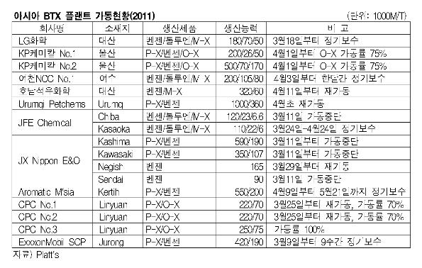 아시아 BTX 시장은 국내의 아로마틱 플랜트의 정기보수가 집중되는 가운데 일본의 가동률 정상화 시기에 촉각을 곤두세우고 있다.