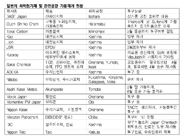 표, 그래프: < 일본의 화학첨가제 및 관련공장 가동재개 현황 > <화학저널 2011/05/03> |