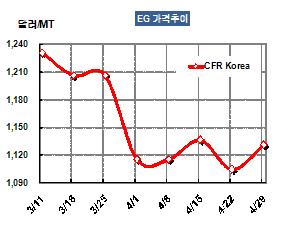 MEG 가격은 4월29일 CFR China 톤당 1131달러로 27달러 상승했다.