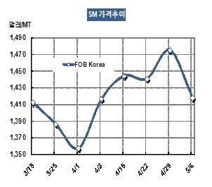 SM 가격은 5월6일 FOB Korea 톤당 1418달러로 57달러 급락했다.