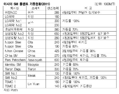 표, 그래프: < 아시아 SM 플랜트 가동현황(2011) > <화학저널 2011/05/12> |