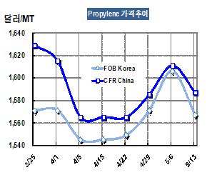 프로필렌 가격은 5월13일 FOB Korea 톤당 1567달러로 39달러 하락했다.