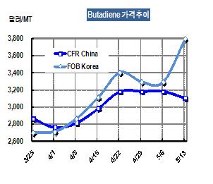 부타디엔 가격은 5월13일 FOB Korea 톤당 3795달러로 505달러 폭등했다.