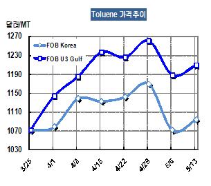 톨루엔 가격은 5월13일 FOB Korea 톤당 1093달러로 22달러 상승했다. 그러나 중국의 톨루엔 내수가격은 ex-tanks 톤당 8850위안에서 8825위안으로 하락해 수입가격 기준 1076달러를 형성했다. 표, 그래프: < Toluene 가격추이 > <화학저널 2011/05/18> |