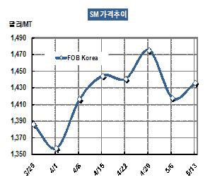 SM 가격은 5월13일 FOB Korea 톤당 1436달러로 18달러 상승했다. 그러나 중국의 SM 내수가격은 1민775-1만800위안으로 263위안 떨어져 수입가격 기준 1377달러를 형성하는데 그쳤다. 표, 그래프: < SM 가격추이 > <화학저널 2011/05/18> |