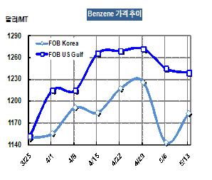 벤젠 가격은 5월13일 FOB Korea 톤당 1183달러로 40달러 상승했다. 미국은 미시시피강 유역에 강우가 쏟아져 주변 정유공장이 가동에 차질을 빚으면 BTX 수급타이트가 심화될 것으로 예상됐으나 다행히 별 영향이 없어 벤젠 가격이 하락했다. 표, 그래프: < Benzene 가격추이 > <화학저널 2011/05/18> |