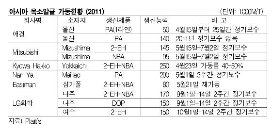 아시아 옥소알콜(Oxo-Alcohol) 시장은 정기보수가 이어지면서 수급타이트가 지속될 것으로 예상된다. 싱가폴 Eastman Chemical이 가동을 중단했던 옥소알콜 8만톤 공장을 5월21일 재가동할 계획이지만 수급타이트를 해결하기에는 역부족일 것으로 판단된다. 표, 그래프: < 아시아 옥소알콜 가동현황 (2011) > <화학저널 2011/05/18> |
