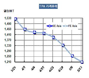 PTA(Purified Terephthalic Acid) 가격이 끝없이 하락하고 있다. ![]() 시장 관계자는 “중국의 시중자금이 얼어붙으면서 폴리에스터 시황도 둔화되고 있어 수요기업들이 구매에 나서지 않고 있다”며 “연쇄적으로 PTA 시장도 가격하락이 계속되고 있다”고 설명했다. 표, 그래프: < TPA 가격추이 > <화학저널 2011/05/19> |