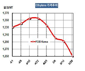 에틸렌 가격은 5월20일 FOB Korea 톤당 1251달러로 40달러 하락했다. 한국을 비롯해 동아시아의 스팀 크래커 정기보수가 마무리국면에 들어가고 PE(Polyethylene) 플랜트들이 수익성 악화로 가동률을 낮춤에 따라 공급과잉이 심화되고 있기 때문이다. 표, 그래프: < Ethylene 가격추이 > <화학저널 2011/05/23> |