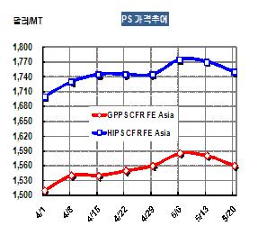 PS 가격은 5월18일 CFR FE Asia 톤당 1560달러로 20달러 하락했다.