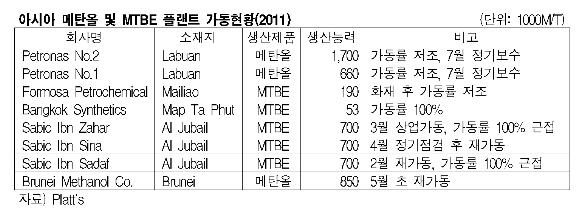 아시아 MTBE(Methyl tert-Butyl Ether) 생산이 활발하게 이루어지고 있다. 한편, 메탄올(Methanol)은 Petronas의 Labuan 소재 No.2 메탄올 170만톤 플랜트와 No.1 66만톤 플랜트가 모두 낮은 가동률을 보이고 있으며 7월 정기보수에 들어갈 계획이다. 표, 그래프: < 아시아 메탄올 및 MTBE 플랜트 가동현황(2011) > <화학저널 2011/05/25> |