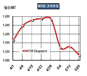 아시아 MTBE(Methyl tert-Butyl Ether) 가격은 FOB Singapore 톤당 1102달러로 40달러 하락했다.