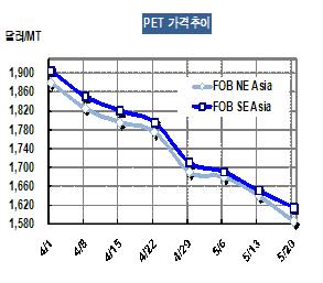 PET 칩 가격이 5월18일 FOB NE Asia 톤당 1585달러로 55달러 폭락했다.