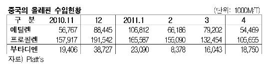 표, 그래프: < 중국의 올레핀 수입현황 > <화학저널 2011/05/30> |