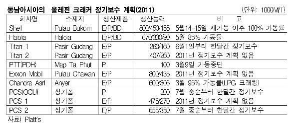 표, 그래프: < 동남아시아의 올레핀 크래커 정기보수 계획(2011) > <화학저널 2011/05/31> |