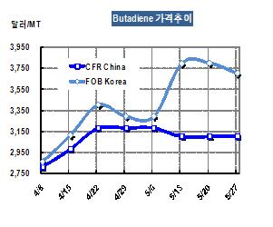 부타디엔 가격은 5월27일 FOB Korea 톤당 3699달러로 100달러 폭락했다.