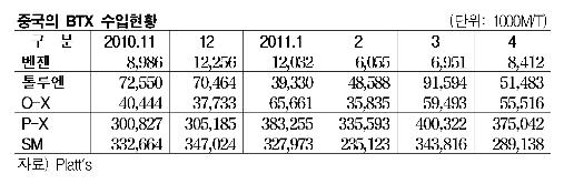 표, 그래프: < 중국의 BTX 수입현황 > <화학저널 2011/06/02> |