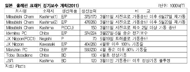 표, 그래프: < 일본 올레핀 크래커 정기보수 계획(2011) > <화학저널 2011/06/03> |