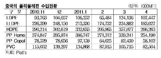 PVC(Polyvinyl Chloride)도 증감을 반복해 2010년 12월부터 2011년 1월까지 13만톤을 넘었으나 2월 9만톤 미만으로 급감한 후 3월 10만톤을 넘어섰으나 4월에는 8만톤을 약간 웃도는데 그쳤다.