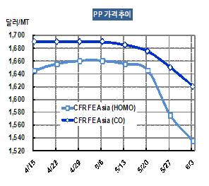 PP 가격은 6월1일 CFR FE Asia 톤당 1535달러로 40달러 급락했다.