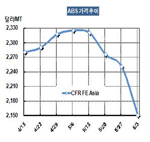 ABS 가격은 6월1일 CFR FE Asia 톤당 2150달러로 100달러 폭락했다.