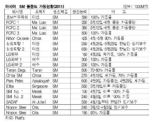 표, 그래프: < 아시아 SM 플랜트 가동현황(2011) > <화학저널 2011/06/08> |